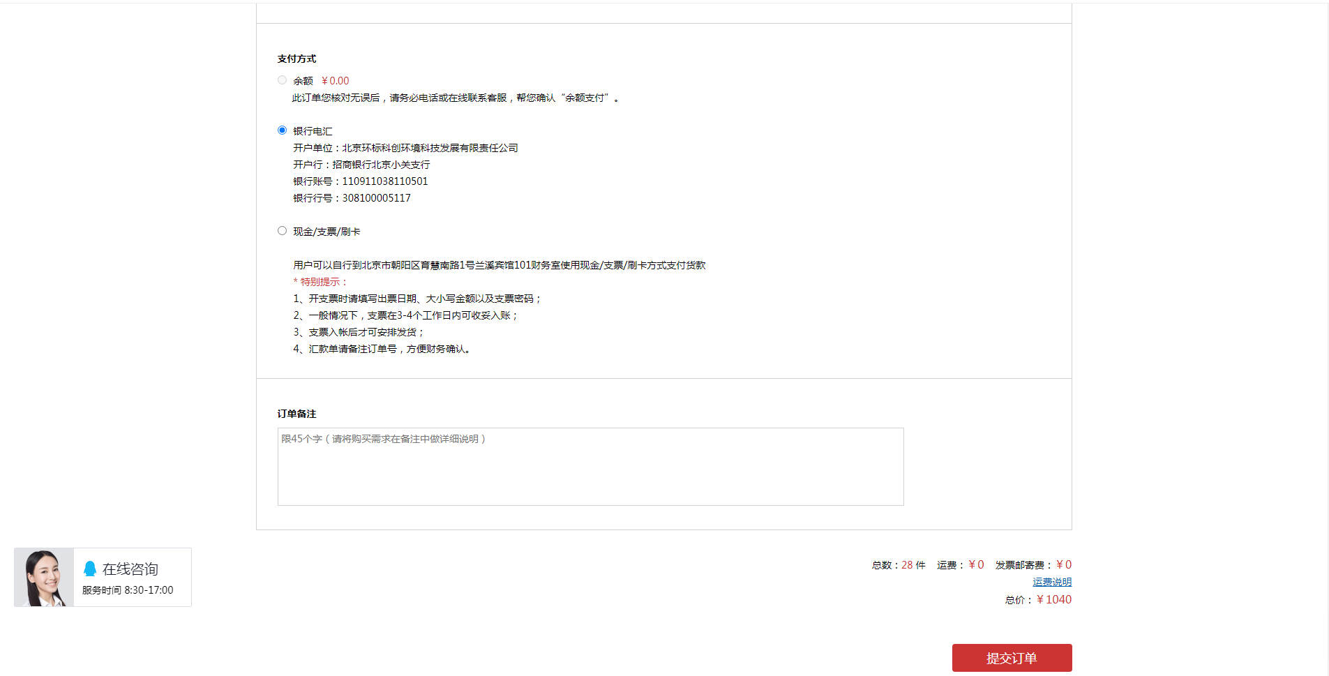 我們目前支持銀行電匯/網(wǎng)銀轉(zhuǎn)賬、現(xiàn)場付款、預(yù)存款三種支付方式,正常情況下,我們會(huì)在1-2個(gè)工作日內(nèi)確認(rèn)到款。